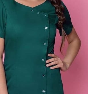 Najnowszy fartuszek kosmetyczny w wersji glamour, to propozycja zarówno dla gabinetów kosmetycznych jak i medycznych. Okrągły dekolt podkreśla i wydłuża szyję. Wygodne rękawki nie krępują ruchów podczas wykonywanych zabiegów. Ten nietuzinkowy fartuch kosmetyczny posiada także pojemne i bardzo praktyczne podczas pracy kieszonki. Tunika zapinana jest na błyszczące, diamentowe zatrzaski-cyrkonie. Bardzo łatwe w zapinaniu i rozpinaniu. Boczne zapięcie tego modelu dodaje klasy i szyku. Uniform jest idealnie taliowany i zgrabny przez co wysmukla kobiecą sylwetkę. Przepięknie dopasowuje się do każdej figury. Odzież kosmetyczna ma duży wpływ na profesjonalny odbiór Twojego salonu i gabinetu, więc nie zwlekaj i bądź Królową w pracy! :)