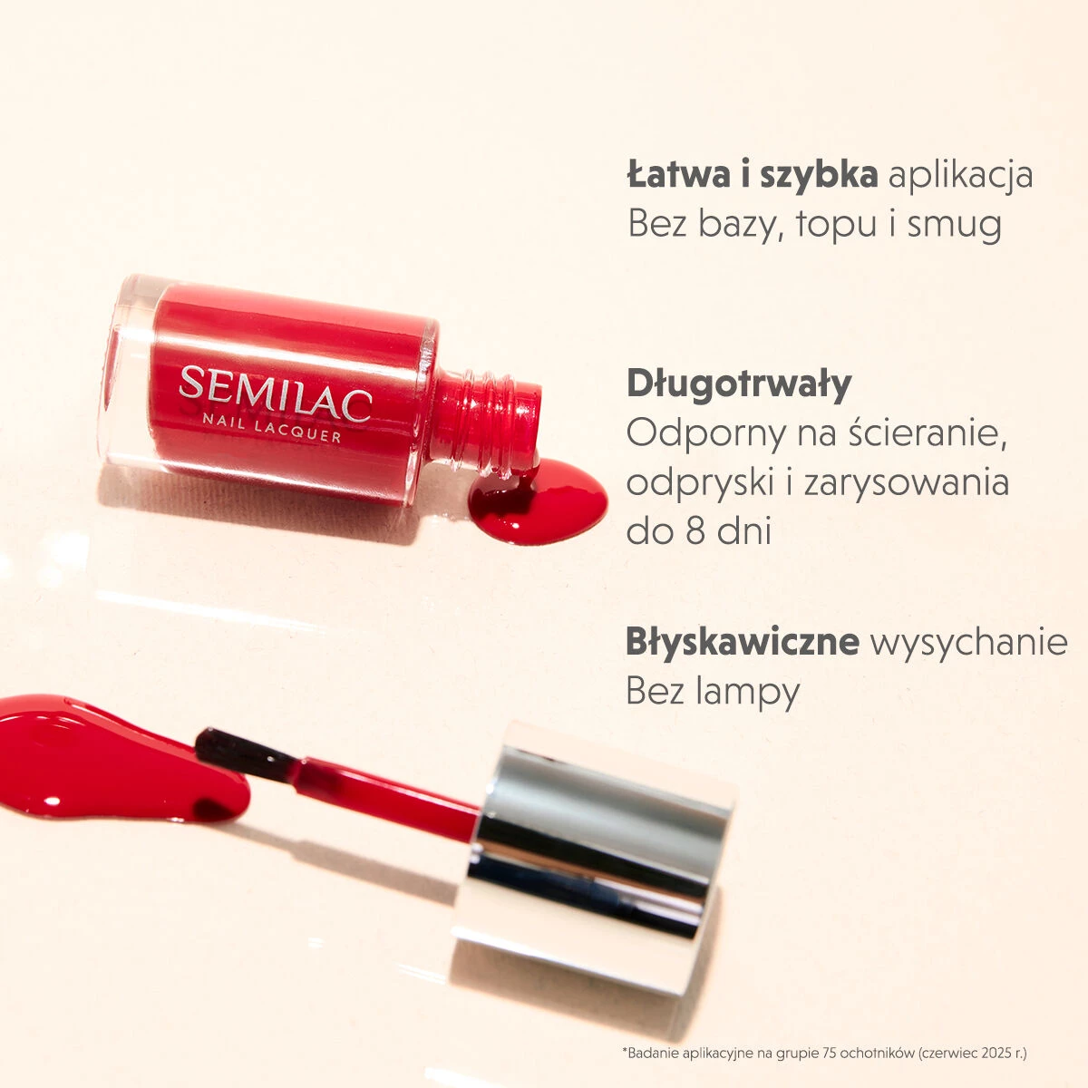 - Nakładanie lakieru kolorowego: Nałóż pierwszą cienką warstwę lakieru i pozwól jej wyschnąć. Kryjące lakiery z linii Semilac Nail Lacquer kryją po 1 warstwie. Czas schnięcia: kilka minut, zależnie od rodzaju i grubości warstwy.