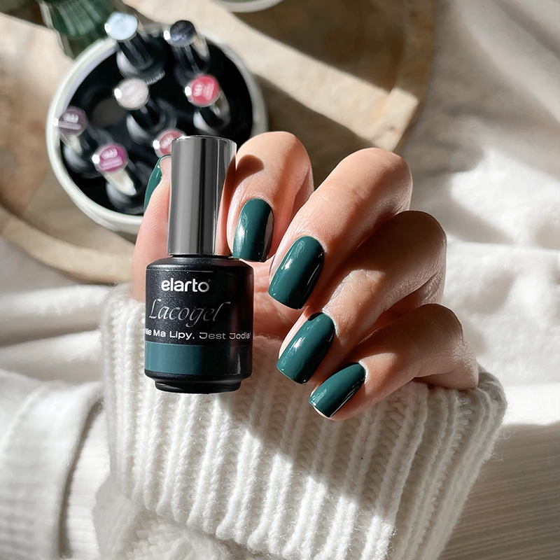 Głęboka, nasycona butelkowa zieleń inspirowana jodłowym lasem. Lacogel 945 marki Elarto to lakier hybrydowy, który łączy elegancję i naturę – idealny wybór dla stylizacji zimowych, świątecznych lub wszędzie tam, gdzie kolor ma znaczyć klasę.