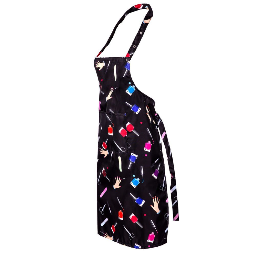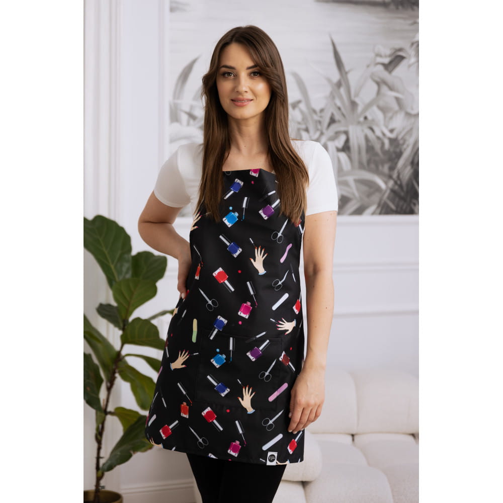 Fartuszek ochronny o klasycznym kroju z printem PANI MANI w czarnej wersji kolorystycznej dedykowany stylistkom paznokci. Klasyczny krój kosmetycznego fartuszka sprawia, że przylega on do ciała i wysmukla sylwetkę. Na fartuszki nadrukowane są graficzne elementy najczęściej związane z branżą beauty. Fartuszek Pani Mani dla stylistek paznokci. Ten wzór pomoże Ci przełamać stonowaną stylizację do pracy i wyrazić siebie.