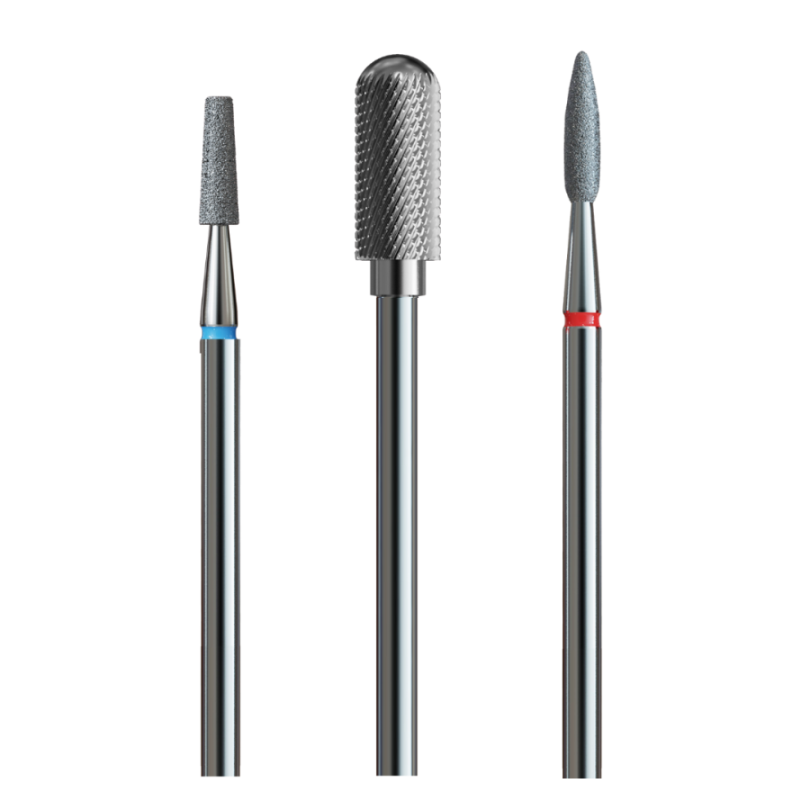- Zestaw trzech frezów must-have do różnych etapów manicure frezarkowego: diamentowy do skórek, węglikowy do usuwania mas i diamentowy płomyk/łezka.