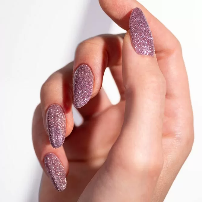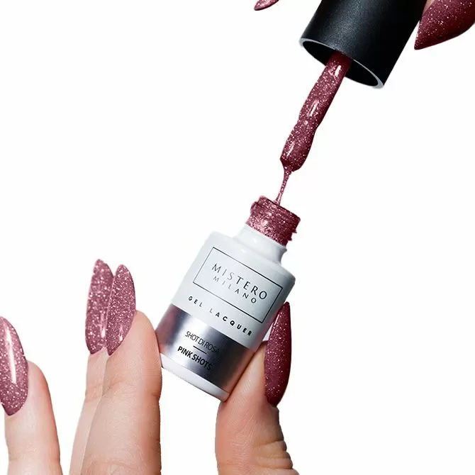 Lakier hybrydowy Różowy shocik to połączenie koloru rose gold z efektownymi,  mikroskopijnymi drobinkami, które dodają elegancji każdej stylizacji.