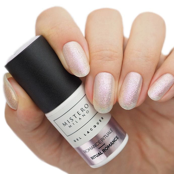 Rytualny Romans to perłowy lakier hybrydowy, który emanuje romantycznym i rozświetlonym nastrój, idealny na dzień ślubu.