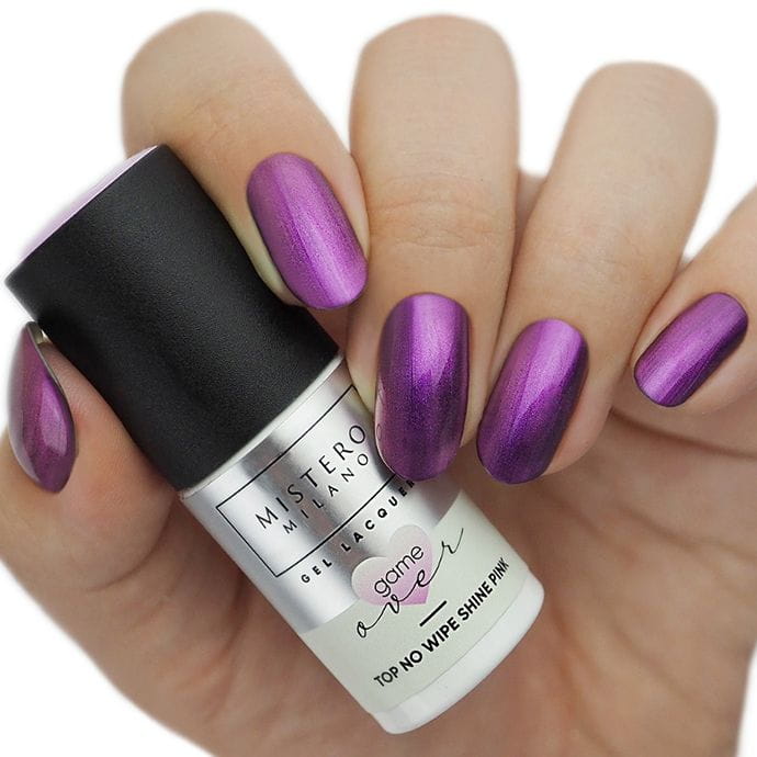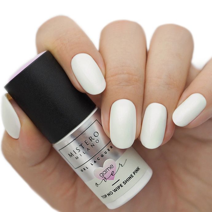 Opis produktu: Top hybrydowy no-wipe Game Over! Shine Pink zabezpiecza ślubny manicure i nadaje paznokciom opalizujący blask, podkreślając subtelność i elegancję dłoni.