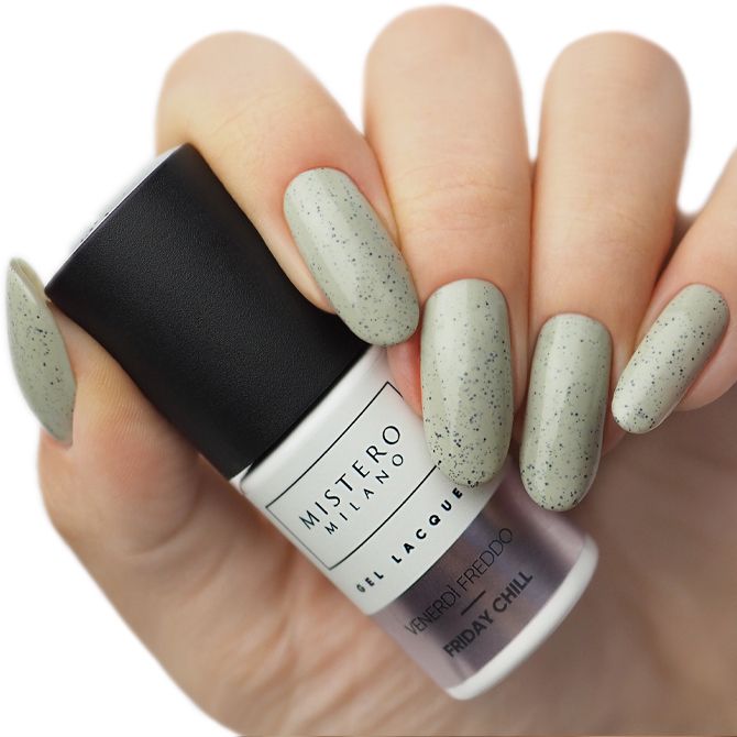 Lakier hybrydowy z efektem kamienia Friday Chill to brudna zieleń z domieszką szarości, wzbogacona o malutkie, czarne drobiny o nieregularnym kształcie, które równo pokrywają płytkę paznokcia zapewniając spektakularny wygląd.