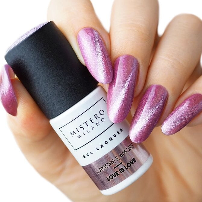 Lakier do paznokci Miłość to miłość to wyjątkowy efekt cat eye – pastelowy, fiołkowy fiolet z wielowymiarową, iskrząca drobina, którą możesz dowolnie modelować! To doskonała propozycja wiosnę dla fanek subtelnego błysku. Manicure hybrydowy z efektem cat eye sprawdzi się zarówno co dzień jak i na romantyczną randkę z miłością Twojego życia.