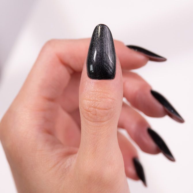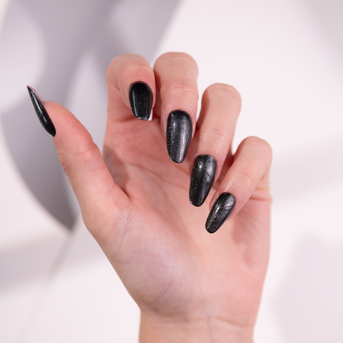 Lakier hybrydowy Make me Hypnotized to głęboka czerń z błyszczącą drobiną, która natychmiastowo przeniesie cię w czarodziejski świat lasu pełnego magicznych istot. To kolor, który przypomina o tajemniczych chochlikach, które skrycie czają się wśród mchu i liści. Manicure hybrydowy wykonany tym kolorem natychmiastowo przeniesie cię w malownicze zakamarki przyrody, gdzie magia i urok spotykają się w jednym miejscu.