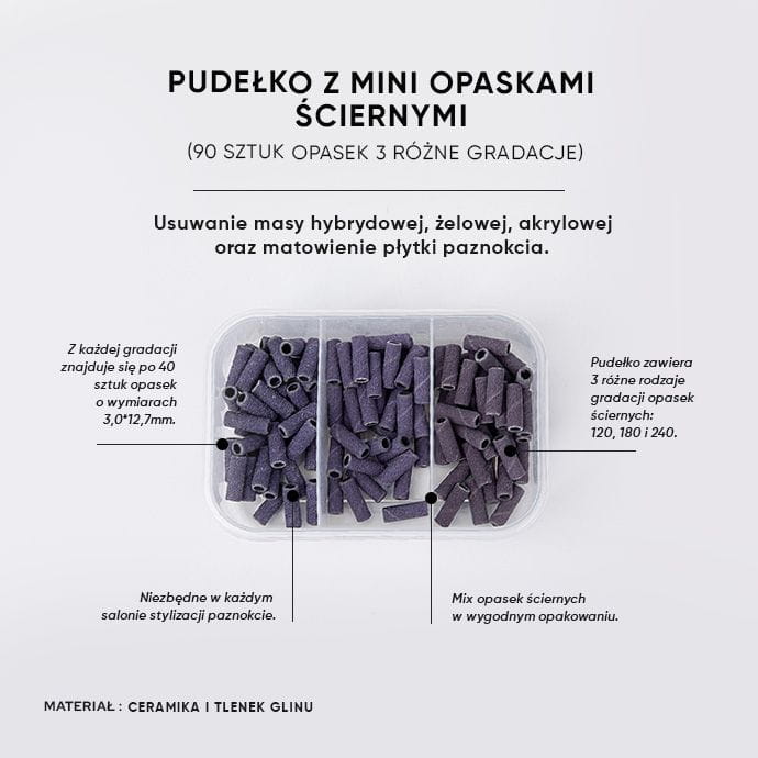 Zestaw 120 mini opasek ściernych to praktyczne i niezawodne narzędzie dla każdej stylistki paznokci. Zawiera po 40 sztuk z każdej z trzech popularnych gradacji (120, 180, 240), co pozwala na idealne dopasowanie narzędzia do etapu pracy i rodzaju materiału. Dzięki kompaktowemu rozmiarowi i wysokiej jakości wykonania opaski sprawdzają się zarówno przy obróbce masy, jak i w wykończeniu stylizacji.