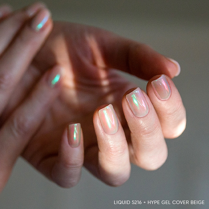 Na utwardzony przez 30-40 sekund Top No Wipe nałóż warstwę płynnego pyłku. Odczekaj 20 sekund, a następnie delikatnie wetrzyj pyłek w płytkę paznokcia, aż uzyskasz jednolitą, lśniącą taflę. Usuń nadmiar pyłku, zabezpiecz wolny brzeg primerem bezkwasowym i nałóż nabłyszczacz. Utwardź całość zgodnie z zaleceniami producenta.