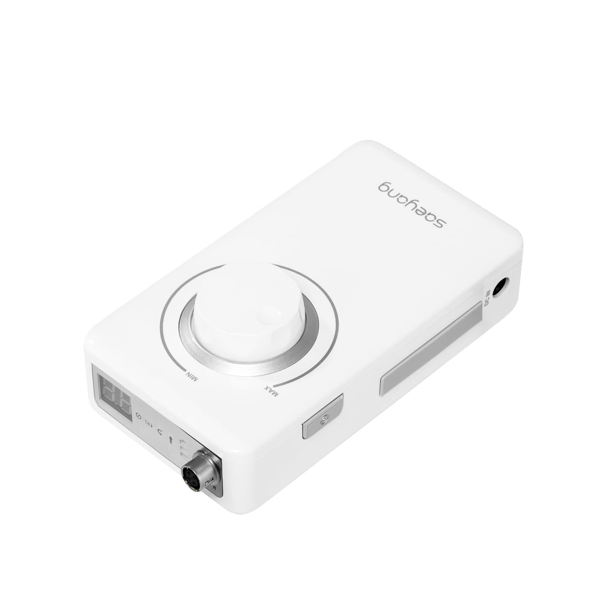 Przy użyciu pokrętła można regulować prędkość pracy głowicy do 35 000 obrotów na minutę, co pozwala na sprawne dostosowanie do indywidualnych potrzeb, a co za tym idzie komfortowe wykonywanie szerokiej gamy zabiegów. Przydatne przyciski umieszczone po bokach pozwalają łatwo przełączyć sterowanie na napęd nożny, zatrzymać pracę urządzenia (funkcja pauzy), a także zmienić kierunek obrotów, co zapewnia pełną kontrolę nad frezarką i ułatwia dostosowanie jej działania do konkretnych usług. Kontrolki LED pozwalają obserwować stan sprzętu – informują o kierunku obrotów, stanie baterii, włączeniu napędu nożnego i pauzy. Urządzenie wyposażone jest w zabezpieczenie przed przeciążeniem z ostrzegawczym sygnałem LED, co chroni silnik przed przegrzaniem, tym samym zapewniając większe bezpieczeństwo pracy oraz chroniąc sprzęt przed uszkodzeniem.
