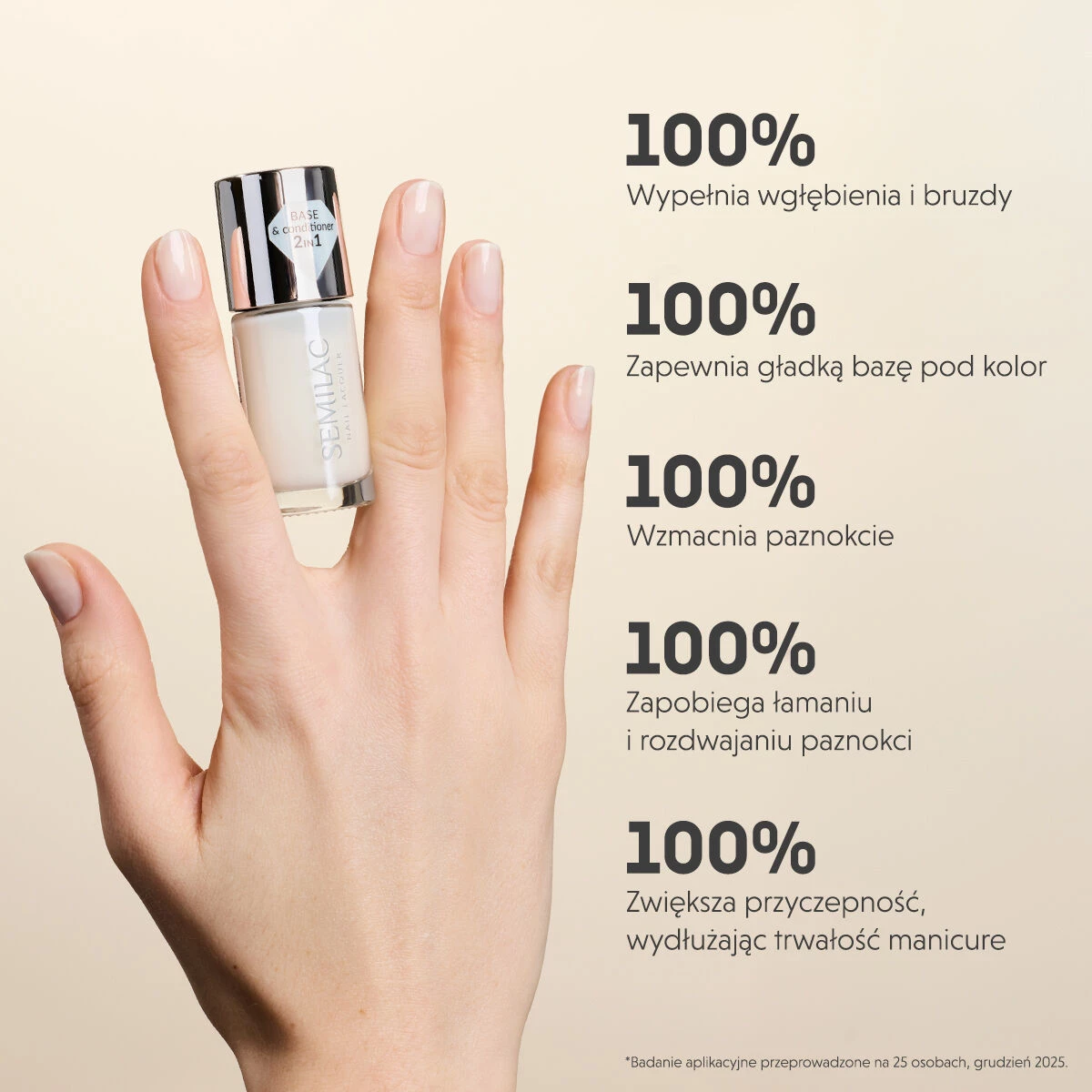 - Wypełnia nierówności, bruzdy i wgłębienia płytki paznokcia.