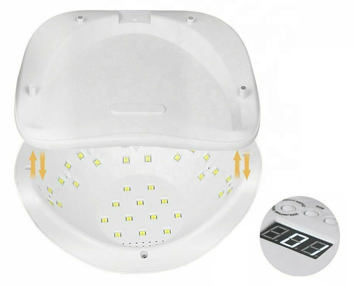 LAMPA DO PAZNOKCI SUNUVLED 54W to profesjonalna lampa UV LED o mocy 54W. Wyposażona jest w 36 wysokowydajnych świetlówek LED o żywotności aż do 50 000h. Nie będziesz musiał wymieniać świetlówek tak jak się to dzieje w klasycznych lampach UV. Doskonała do utwardzania żeli LED oraz lakierów hybrydowych LED. Umożliwia komfortowe utwardzanie paznokci u rąk i stóp. Wbudowany TIMER - 4 czasy utwardzania: 10 sek., 30 sek., 60sek. oraz 99 sekund w trybie double power. Specjalnie zaprojektowany odblask wzmacnia działanie promieni UV. Odpinane dno na magnesy ułatwia czyszczenie lampy. Posiada wygodne sterowanie za pomocą przycisków na górze urządzenia: Zasilanie za pomocą dedykowanego zasilacza 12V DC.