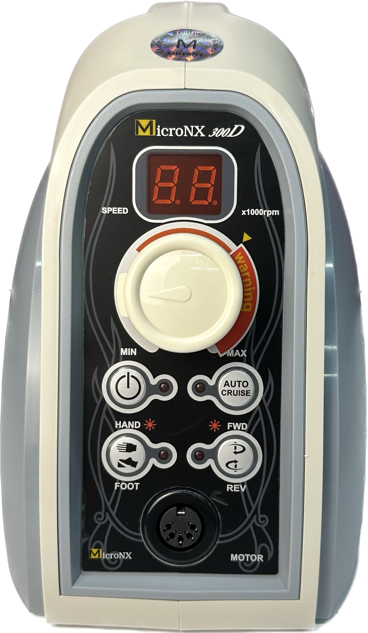 Modele 300D i 300S wyposażone zostały w sterowniki nożne umozliwiające regulację predkości obrotowej. Im mocniej naciskany jest sterownik, tym wyższą prędkość obrotową prostnicy uzyskamy. Maksymalna prędkość, której sterownik nożny nie przekroczy, ustawiamy recznie za pomoca, potencjometru znajdujacego sie na panelu przednim urządzenia.