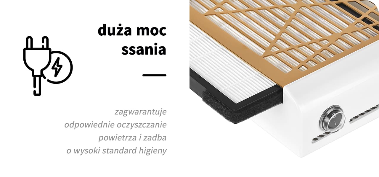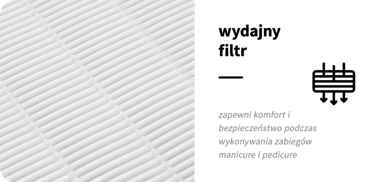 Osoby wykonujące zabiegi z użyciem frezarki narażone są na długotrwały kontakt z pyłem, warto zatem postawić na silny pochłaniacz, który zapewni odpowiednie oczyszczanie powietrza. Pozwoli to zadbać o wysoki standard higieniczny salonu oraz zapewni komfort zarówno stylistce, jak i klientkom.
