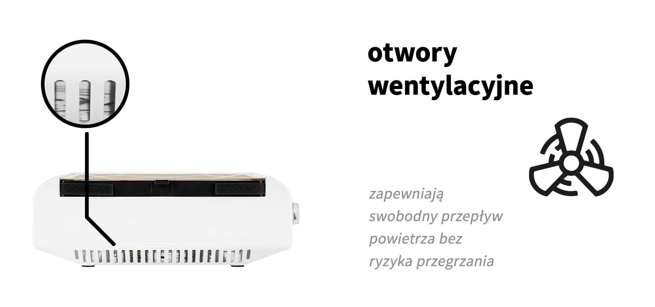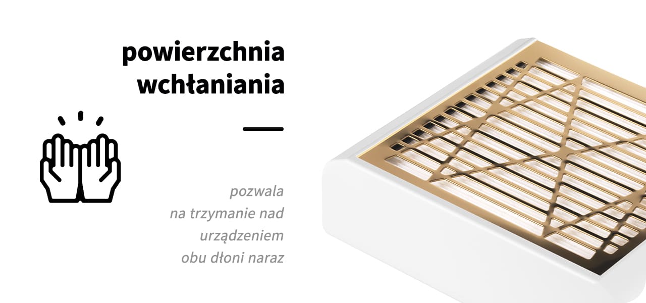 Duża powierzchnia wchłaniania pozwala na trzymanie nad urządzeniem obu dłoni naraz, a dzięki znacznej wydajności pochłaniacza zanieczyszczenia są wchłaniane wprost do filtra, pozostawiając stanowisko pracy czyste i wolne od szkodliwego pyłu. Odpowiednio rozmieszczone od spodu urządzenia otwory wentylacyjne zapewniają swobodny przepływ powietrza. Wentylator może dzięki temu pracować nieprzerwanie przez dłuższy czas, minimalizując ryzyko przegrzania.